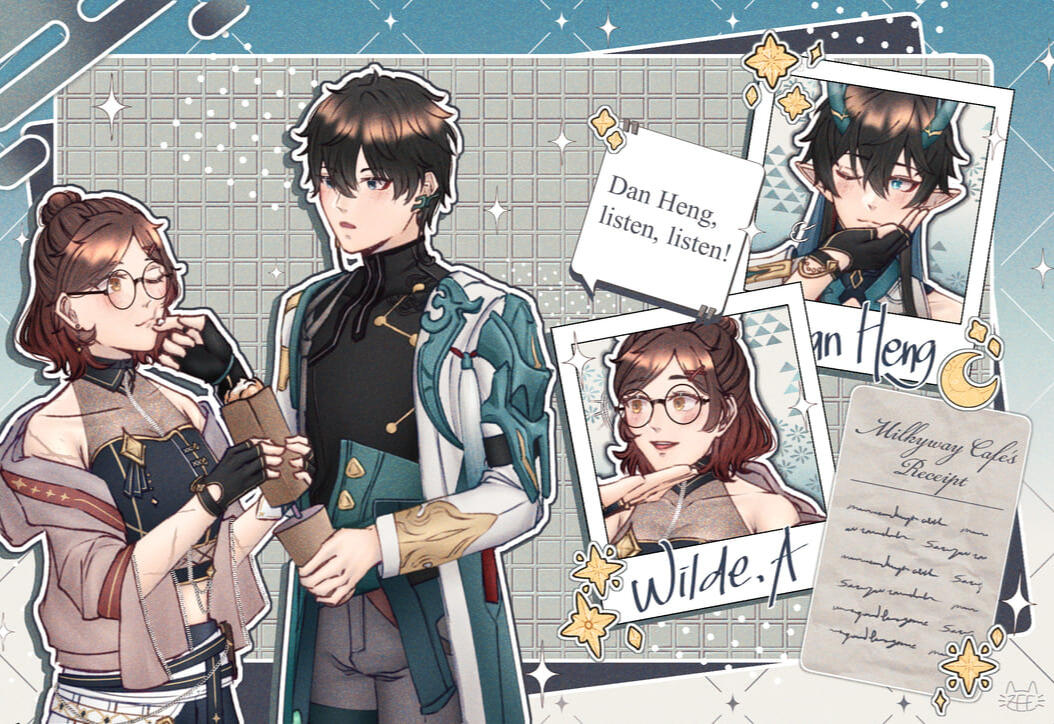 | Royal Milk Tea Latte | Starts from 400k, depends on details, pose, and complexity. | customizable couple waist/thighs-up and two headshot/bust-up poses, stickers, text, and color themes. |